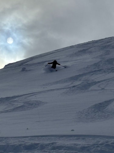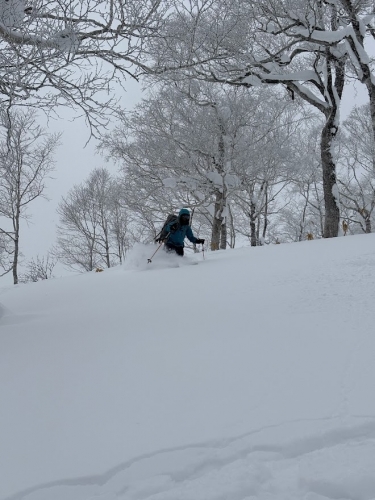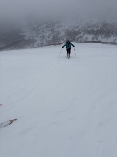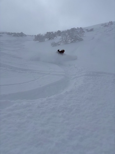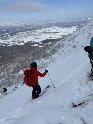 1000mを越えると風が山肌をなでるように舞い、トレースも所々消えかかる。傾斜が増し、雪面が固くなってきた1200m付近を最終到達点にする。右側の少し窪状になった斜面で、気持ちよくターンを繰り返す。極上ではないものの今回のツアーで一番感触が良かったかもしれない。樹林の中もノートラックの斜面だと気持ちは高まる。あっという間だったが後方羊蹄山を楽しめた。