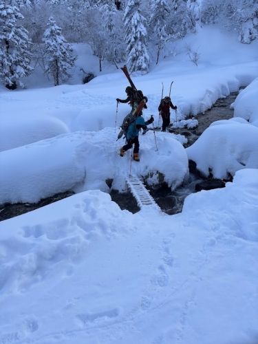 風は弱く、放射冷却で肌を刺すような冷え切った空気に、露出した耳や頬が痛い。パウダーランドと言われる十勝連峰の西側に位置する富良野岳の一日が始まる。富良野思惟林の駐車場に車を駐車し、車道を100mほど下り、沢へと降りる。北尾根手前の沢には橋がかけられている。