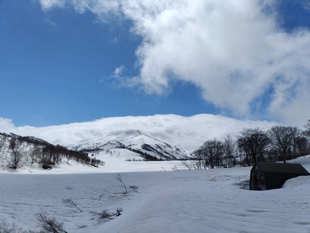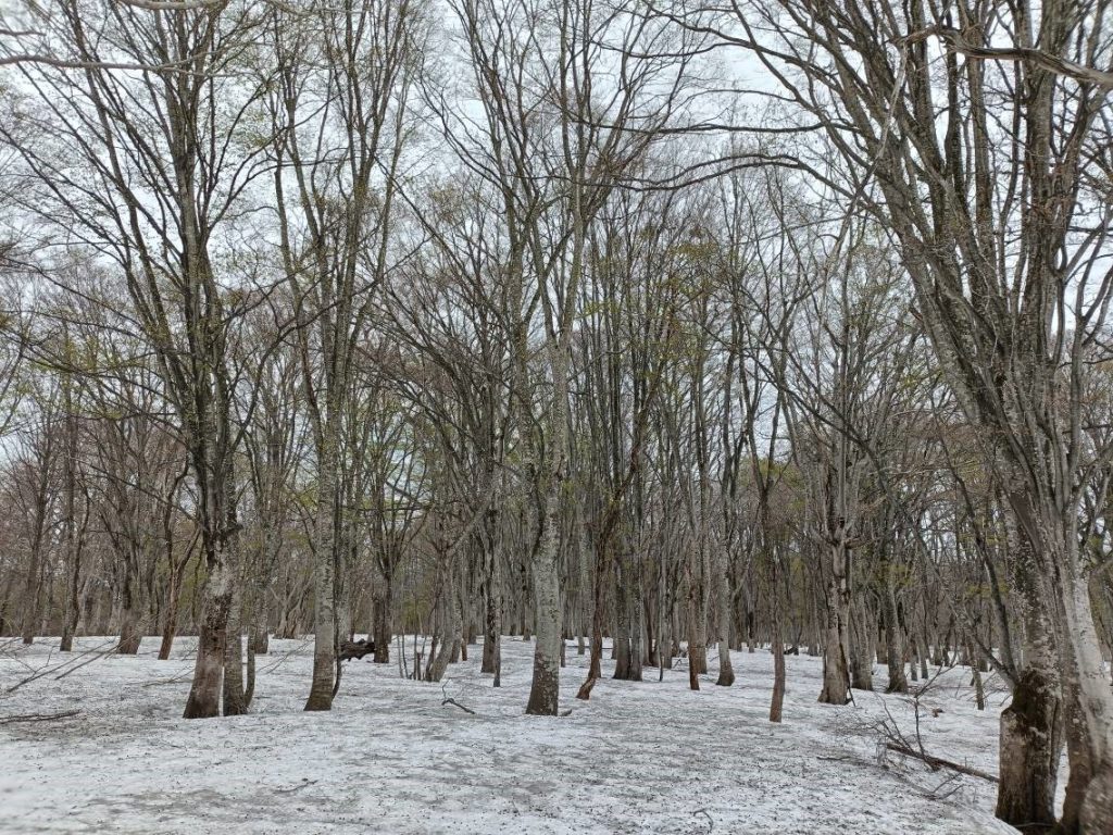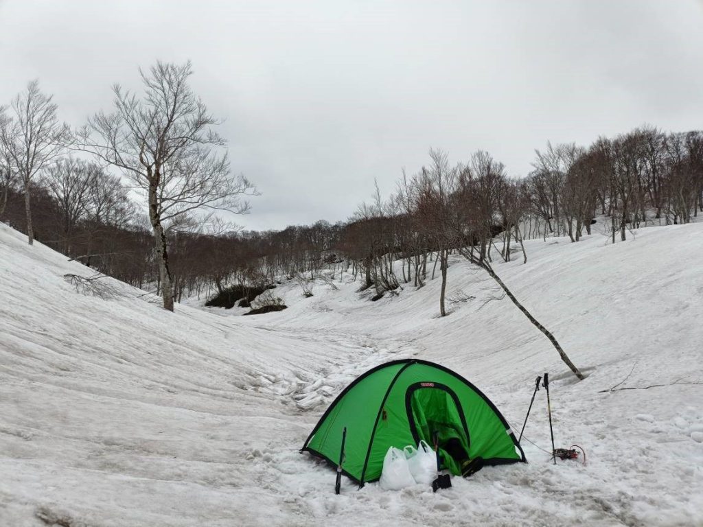 新宿バスタから寝てれば山形。夜行バスは快適だ。山形駅から新庄までローカルで、肘折温泉終点まで温泉バスで向かう。山奥のレトロな温泉街に後ろ髪をひかれつつ、大きく膨らんだザックでよろよろと歩き出した。曇り空でまあまあ快適な天気でもあり、月山方面から降りてくるスキーヤー2組。1組は8名ほどの団体さんで西川町山岳会恒例の念仏小屋ツアーとのこと(後日月山で聞いた話)。途中大森山のところで違った方面に入ってしまったが、あたり一面全ブナ林の森で見事であった。この日は赤沢川の源頭付近でタイムアウトとなった。