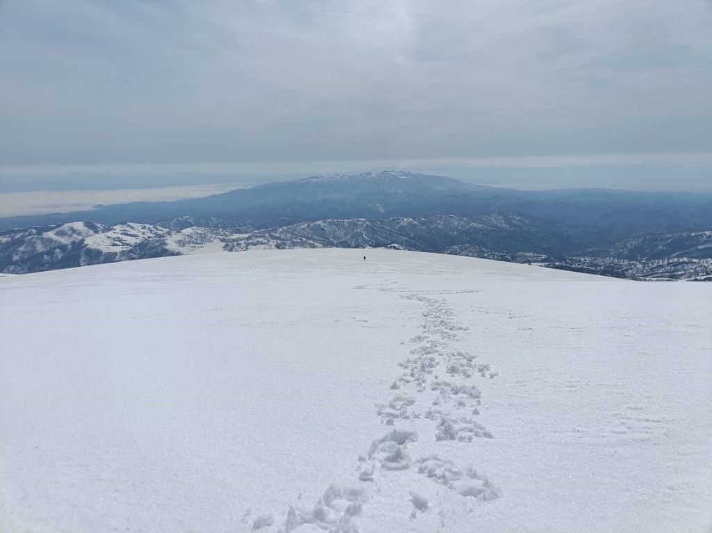 昨年9月の真沢以降全く山行をしていないので、そろそろ雪山に入りたいと思って大井沢から障子ヶ岳へ入ったのは3月下旬。久々の単独の重さもあって竜ヶ岳までとなったものの、雪の中のブナ林は最高であった。ただ、消化不良気味でもあったので、このGWは一人で和賀の続きでも歩きに行こうかなと思案していたところ、宮内さんから表記のお誘いがあって、地図を見てみると朝日まで縦走できればこれは面白そうと思い、速攻で夜行バスを予約してしまった。