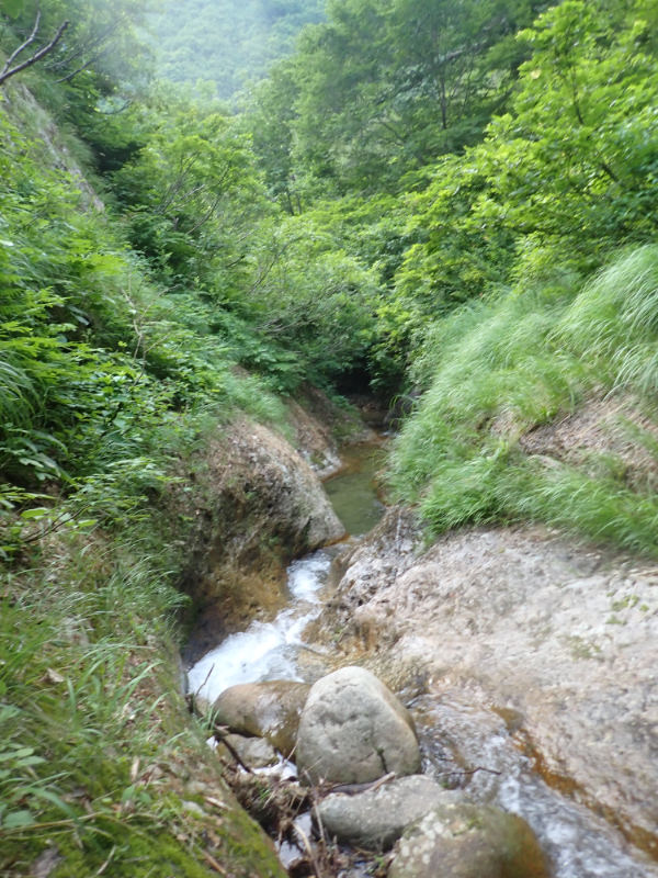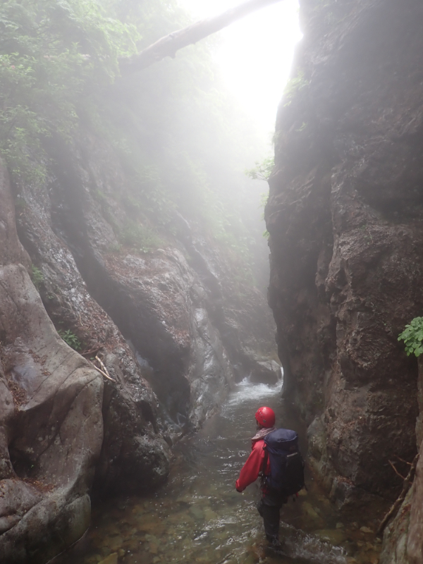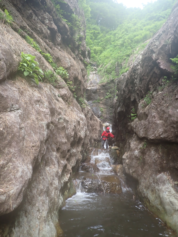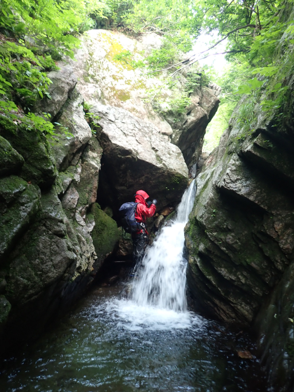 ・青里岳から本流中滝沢への下降は沢の連続。懸垂シュリングを使い果たしてしまう。
