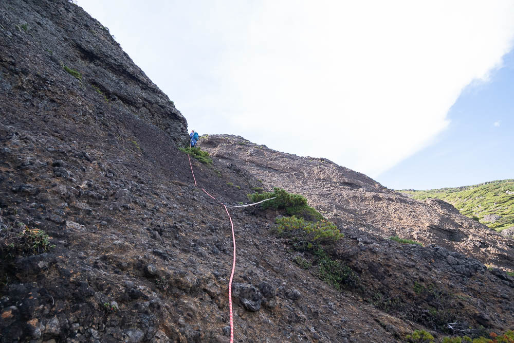 一度沢に戻るが、支点取るのが難しそうな滝が見えたため、再度大高巻き。