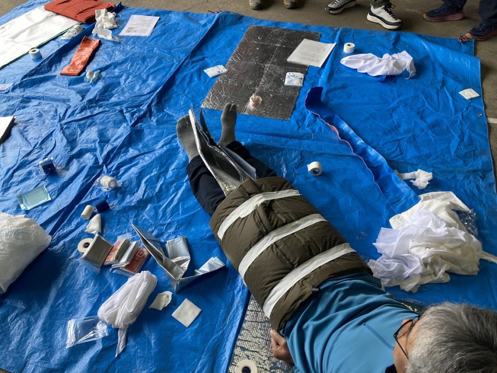 また、軽量なアルミ合金にポリウレタンフォームを張り合わされて作られた「サムスプリント」の活用。外傷による頸椎損傷の念頭に、首の動きを制限するために、首にゆるく巻いてしっかり成形する。軽量なこともあって、参加者はその有効性を口にしていた。この「サムスプリント」は前腕骨折の副子にも有効性が確認できた。「サムスプリント」を健常な腕でC型に折り曲げて型取りしてから、骨折している腕にあて、テーピングテープ等で固定し、三角巾で固定すると安定する。
